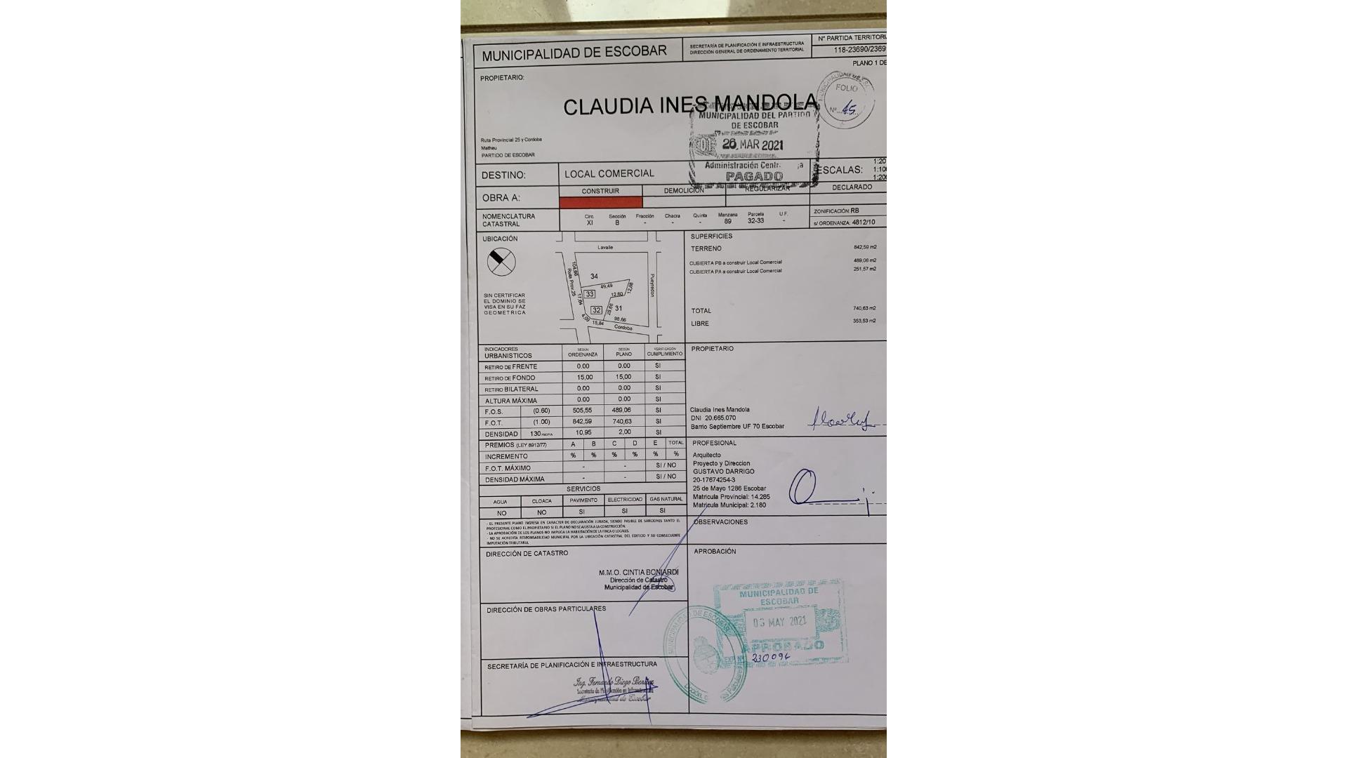 Plano municipal aprobado(740 m2 cubiertos, ente planta alta y planta baja).-