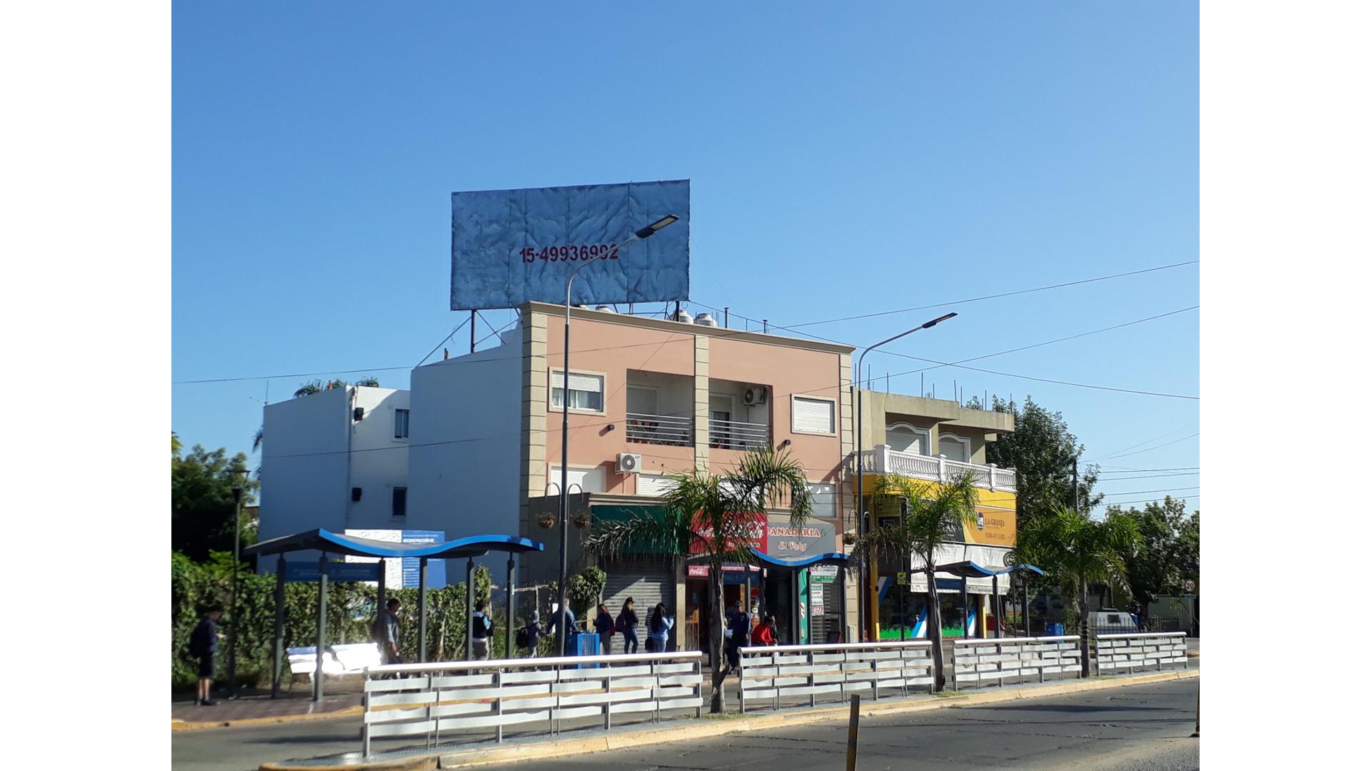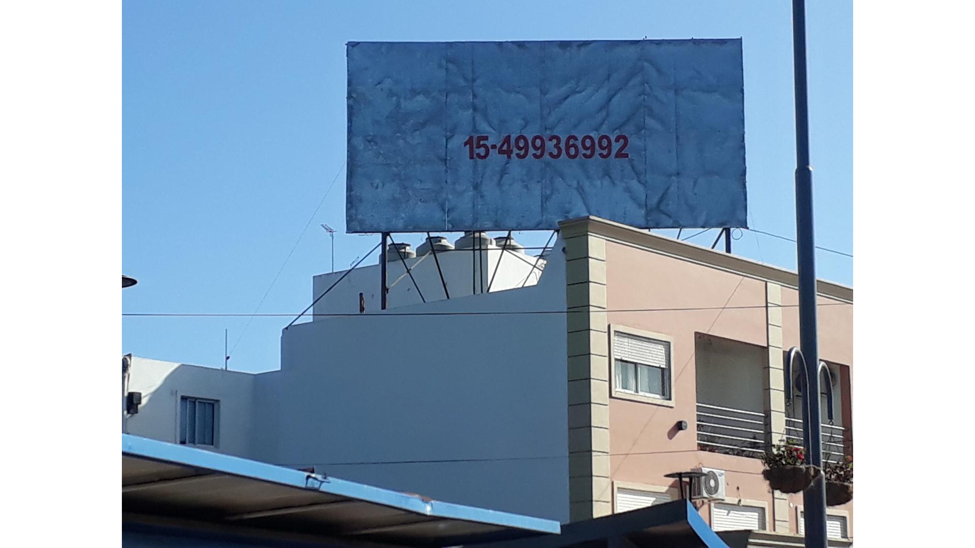 Un cartel ubicado en la terraza del edificio sito en la Avenida 25 de mayo 1315 de la ciudad de escobar, partido de Escobar, Provincia de Buenos Aires.-