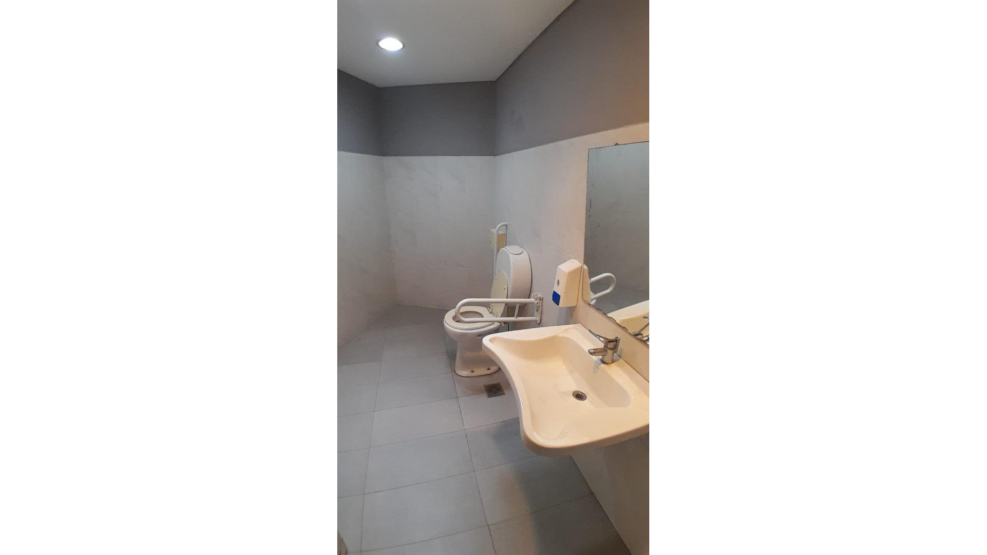 Batería de baños de hombre, de mujer y baño accesible para personas con movilidad reducida.